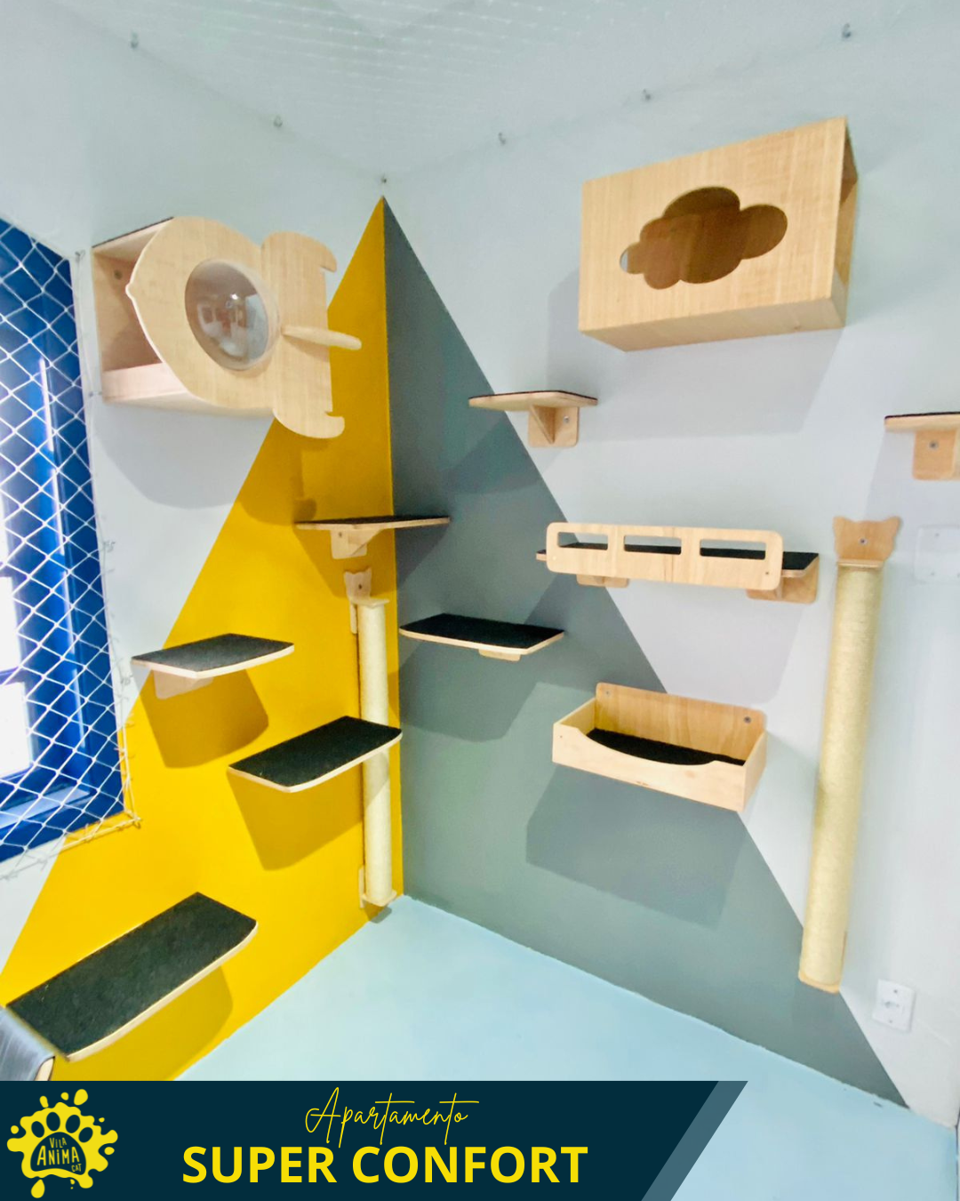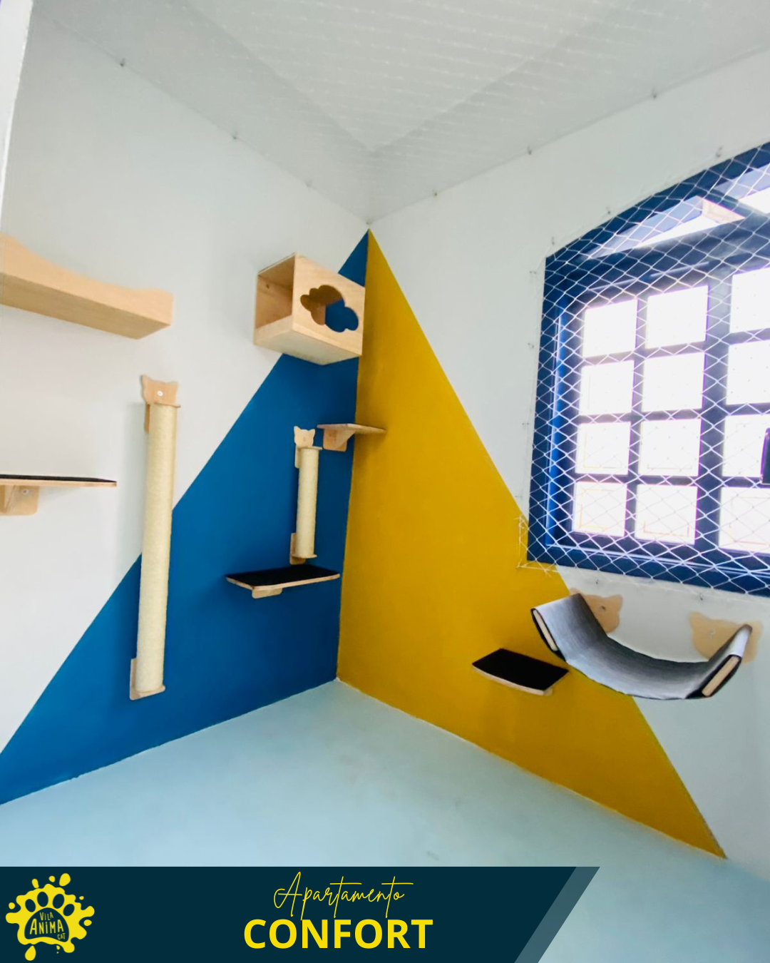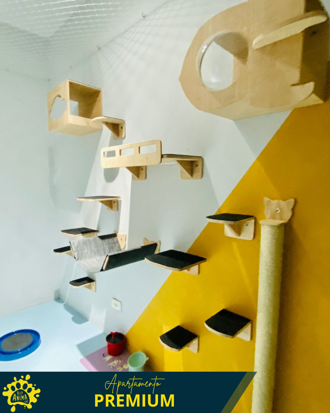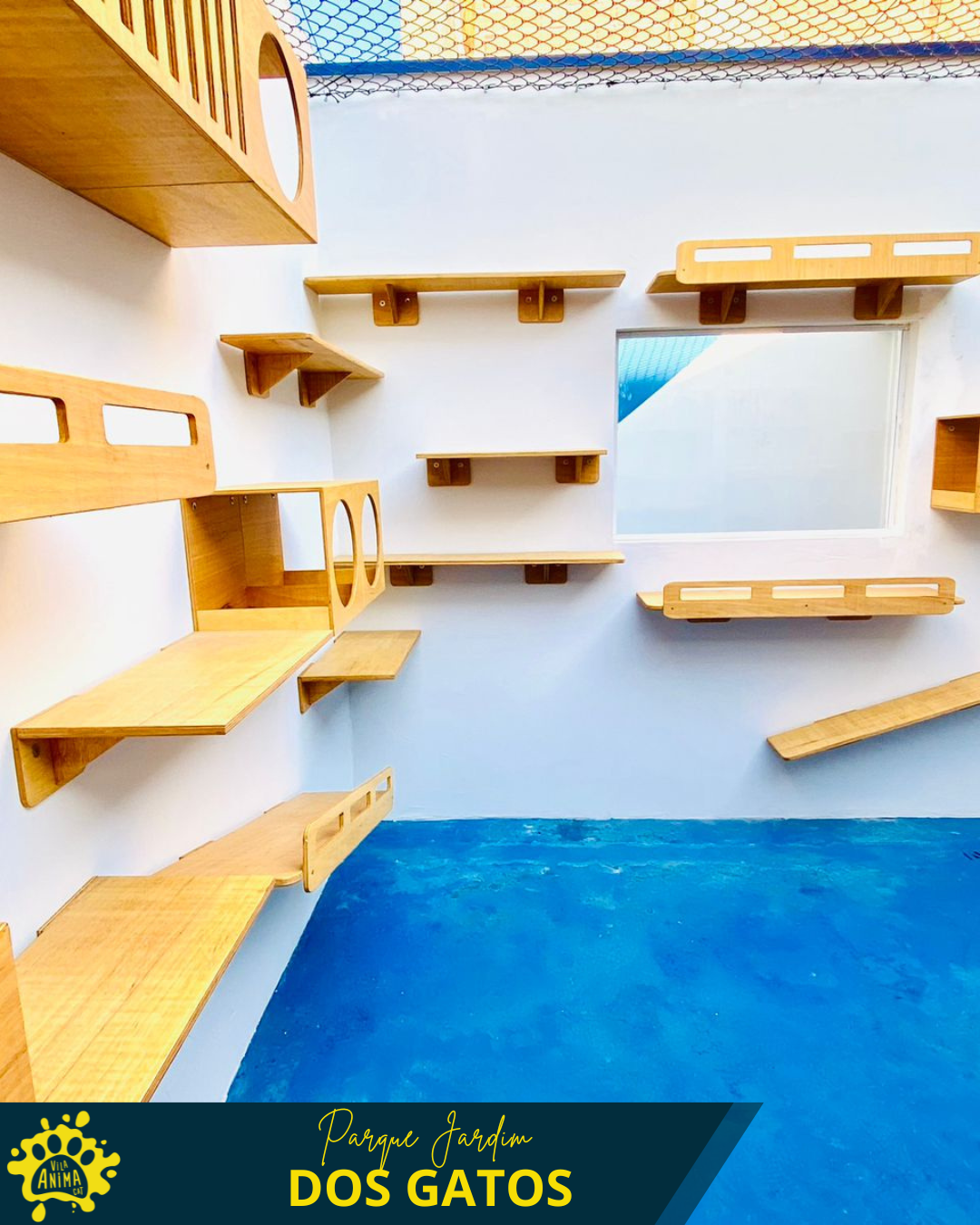 Com apartamentos cuidadosamente projetados e equipados para o seu gatinho, o VILA ANIMA CAT conta também com 3 áreas de playgraounds externos super gatificadas onde os hóspedes têm acesso para brincar, tomar sol, conhecer novos espaços e explorar verticalmente. Mas pode ficar tranquilo: todas as áreas são protegidas, teladas e sem nenhum acesso à rua. SEGURANÇA aqui é prioridade número um!