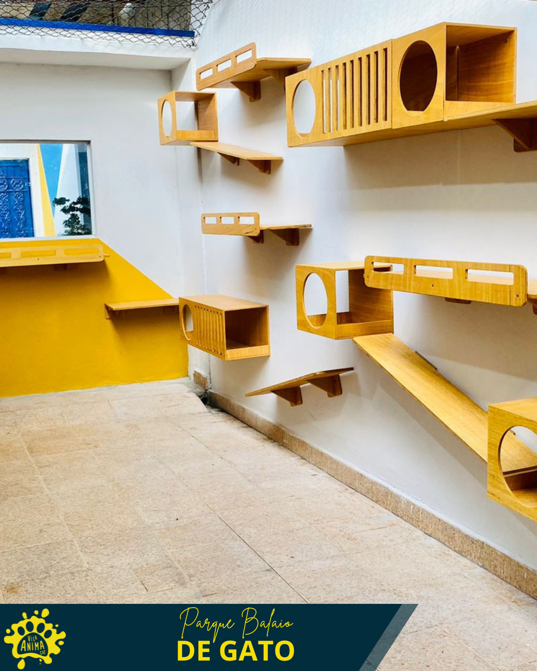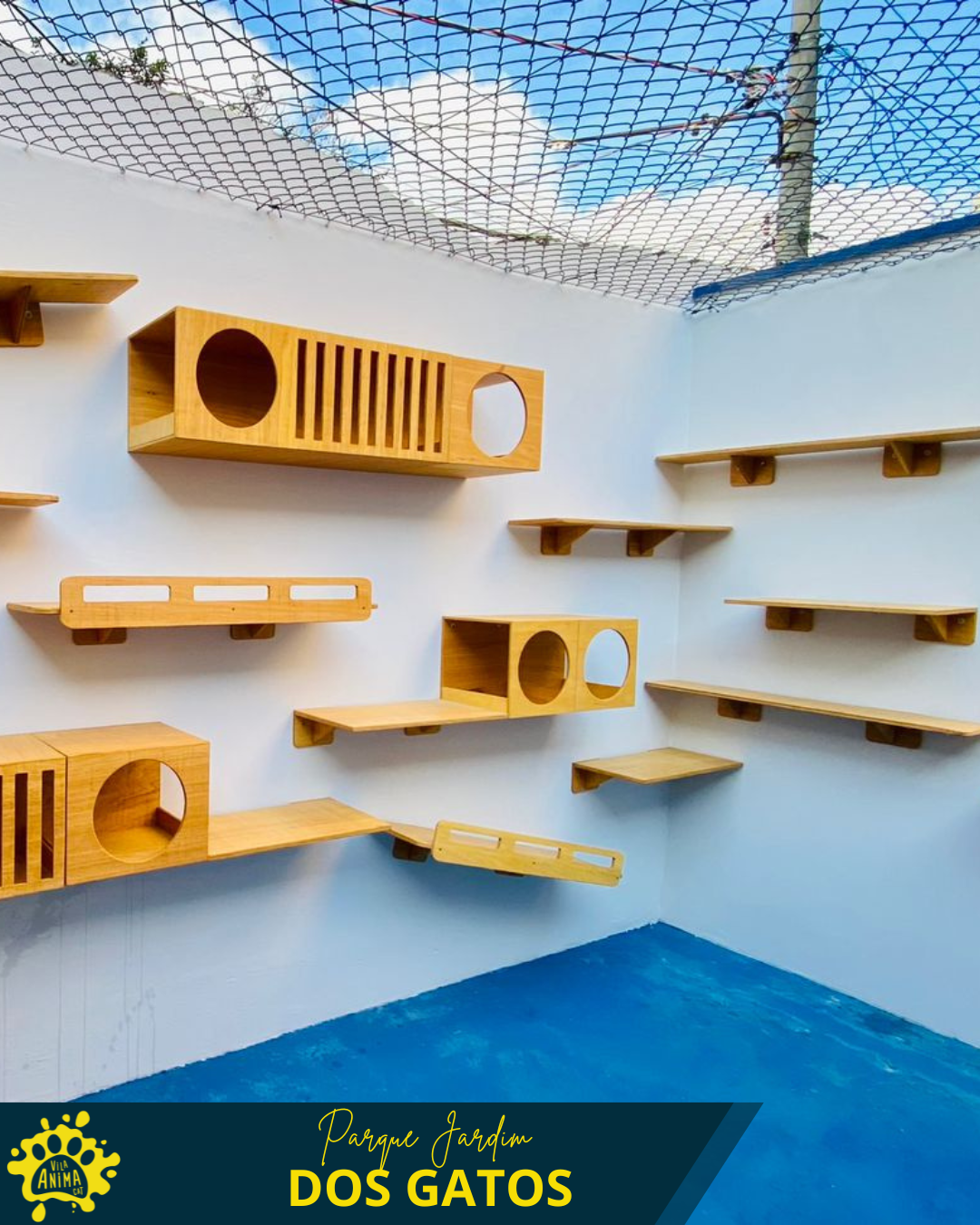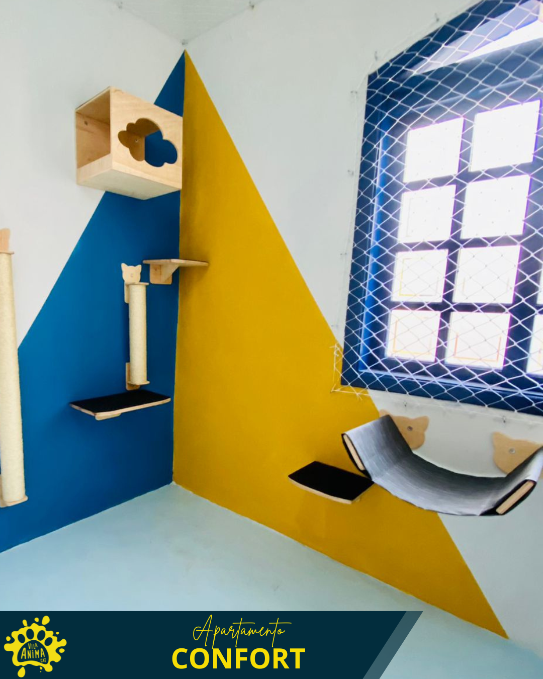 Com apartamentos cuidadosamente projetados e equipados para o seu gatinho, o VILA ANIMA CAT conta também com 3 áreas de playgraounds externos super gatificadas onde os hóspedes têm acesso para brincar, tomar sol, conhecer novos espaços e explorar verticalmente. Mas pode ficar tranquilo: todas as áreas são protegidas, teladas e sem nenhum acesso à rua. SEGURANÇA aqui é prioridade número um!